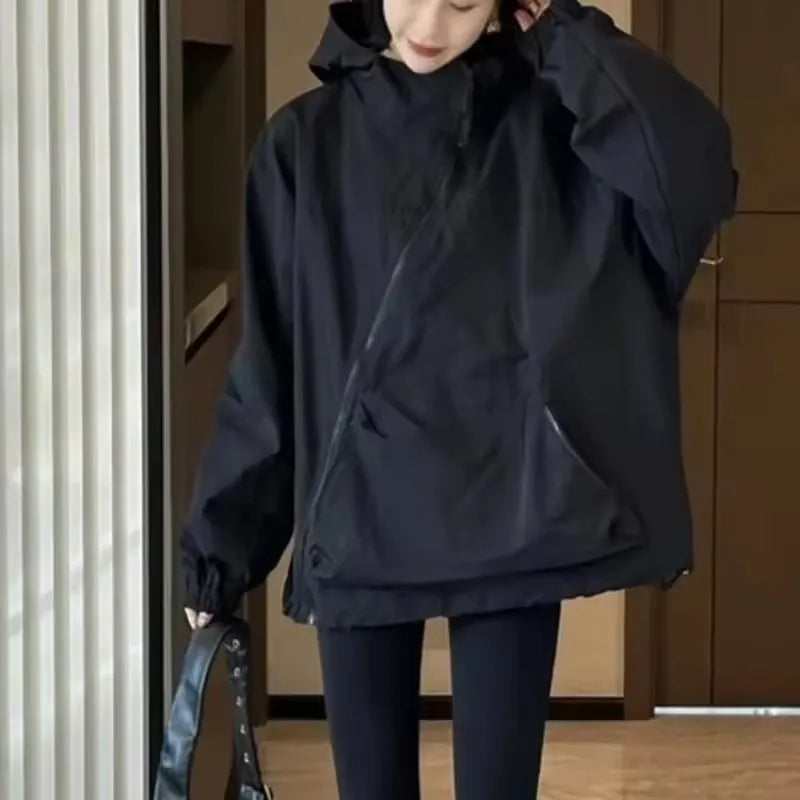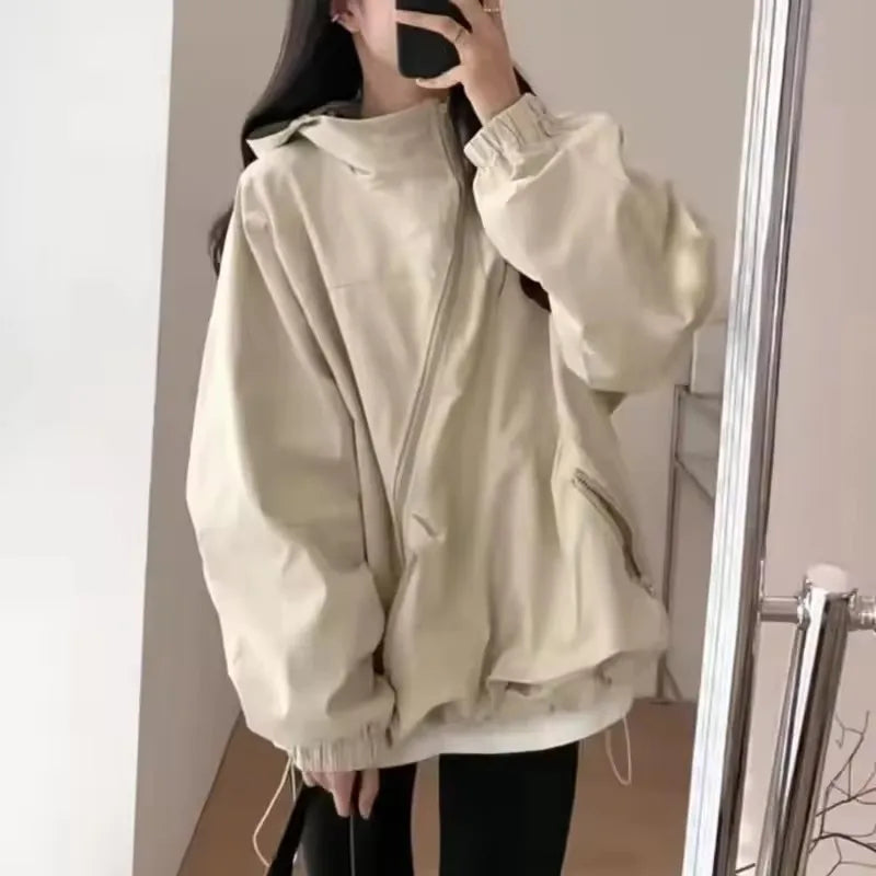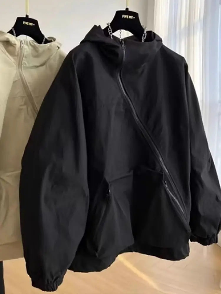 Fashion Women Hooded Jackets Diagonal Zipper Design Vintage Autumn Baggy BF Outdoor Leisure All-match Chaqueta Mujer
